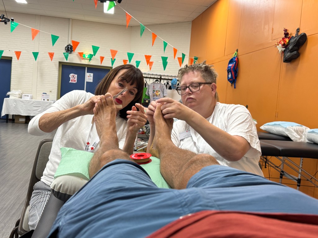Deze lieve mensen van het Rode Kruis hebben maandag mijn voetjes keurig preventief ingetaped! Vanaf dinsdag geldt: ‘willen is kunnen!’
