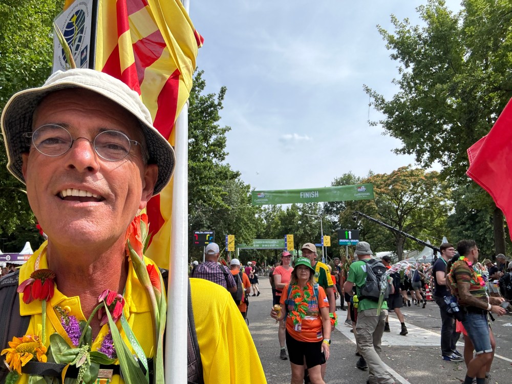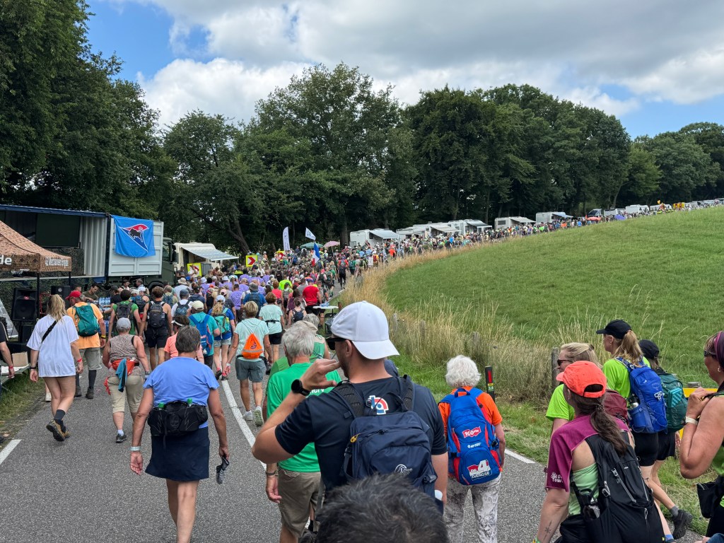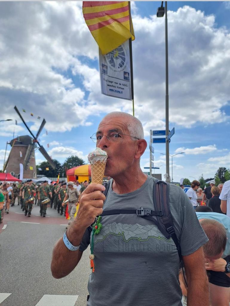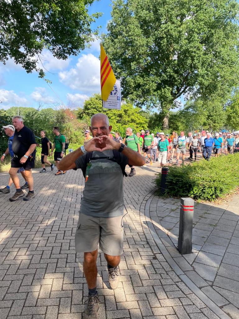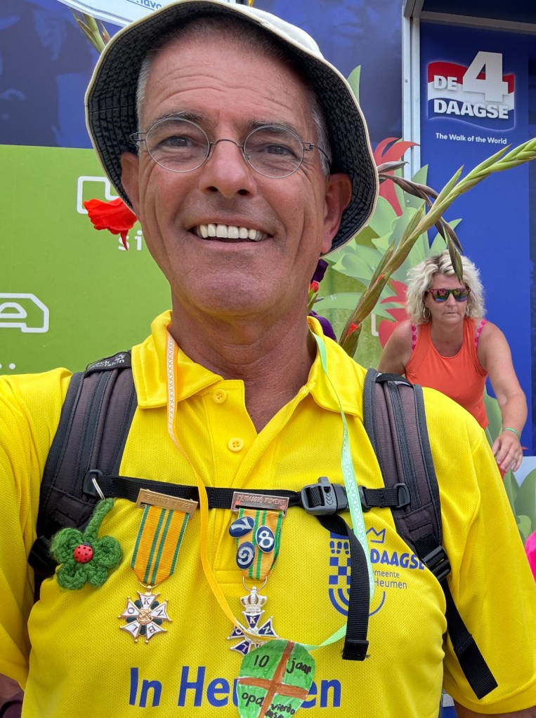 Wat was dat weer een enerverende wandelweek! En de Vierdaagse is alweer voorbij! 🥾 We hadden op een paar pittige buien na prachtig wandelweer, de gladiolen zaten weer in mijn rugzak en mijn voeten waren na 3 dagen ‘goed ingelopen’. Deze 10de keer is een fantastische herinnering geworden! Ik merk dit jaar – waarin ik 70 ben geworden – wél bij het wandelen dat de leeftijd gaat meetellen. Het wandeltempo is wat trager, toch doen de voeten helaas net zoveel pijn als voorheen. Elke stap voel je dus goed en doorleef je zodoende. Dat is denk ik wel het summum van ‘het leven in het hier en nu’. Haha 😅 Dit jaar had ik voor de allereerste keer 0 blaren! Alleen wat rauwe voeten en vermoeide spieren. En na de eerste kilometers wandelen weet ik: ‘dít is het voor deze week en het wordt niet erger’. Gewoon doorbikkelen en dan komt de finish vanzelf elke dag weer in het zicht. Vanaf vrijdagavond is alles in de ruststand gegaan en kan ik nagenieten van een heerlijke wandelweek! Gedurende de hele week zag ik talloze mensen met een lach op het gezicht. Met zoveel nationaliteiten waren we bij elkaar en dat zonder wanklanken! Kon het in de echte wereld ook maar zo zijn!