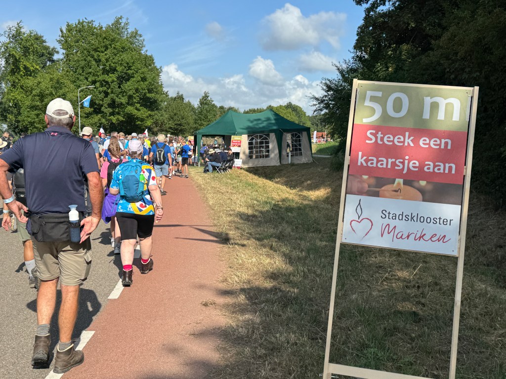 De kerk in Mook heeft altijd de deuren open voor de wandelaars tijdens de Vierdaagse om even een kaarsje op te steken voor een moment van bezinning en om een pelgrimszegen te ontvangen