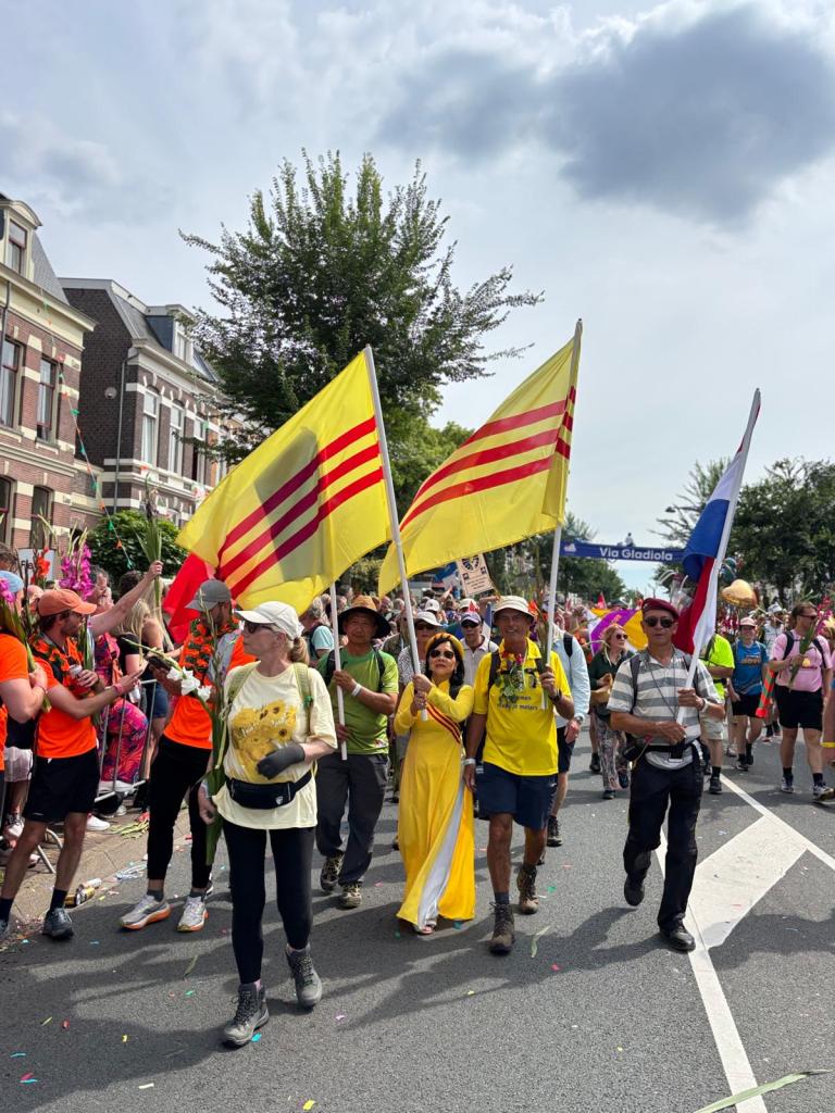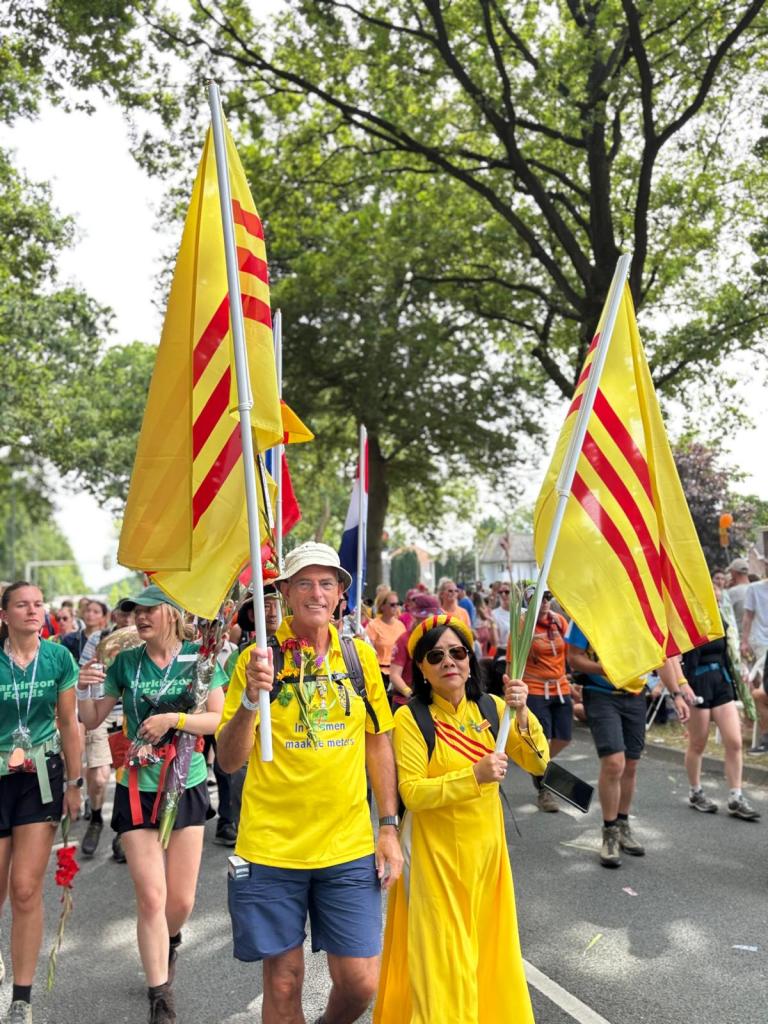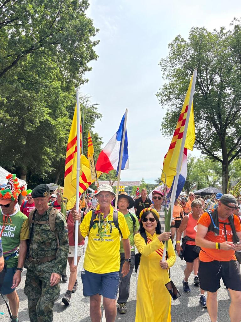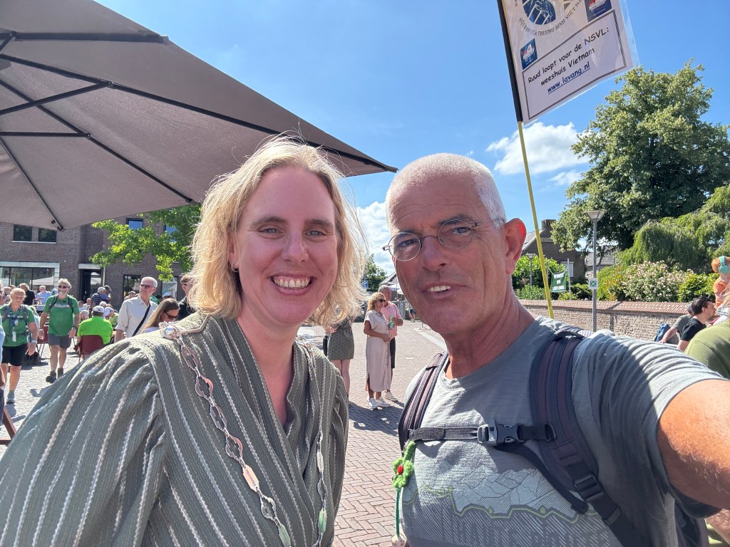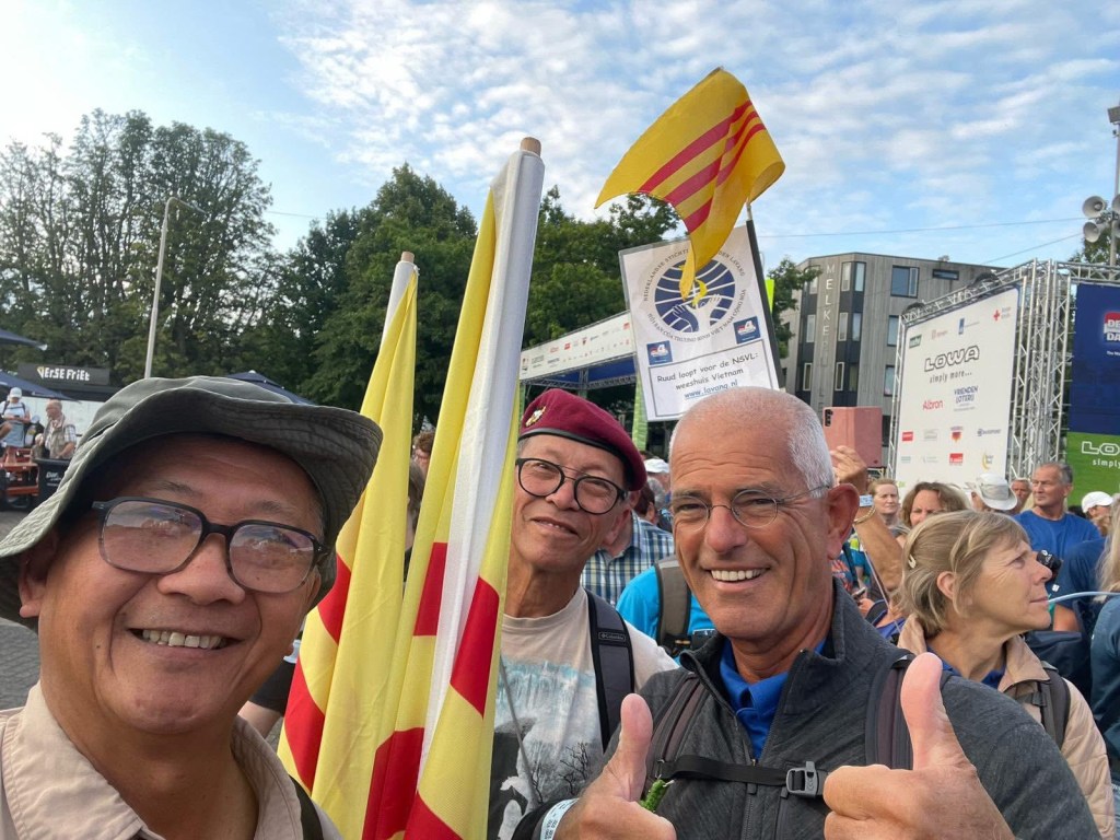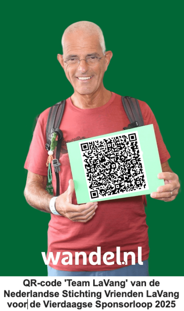 Onderweg spraken nogal wat wandelaars mij aan vanwege de Vietnamese vlag (geel met 3 rode banen) waar ik altijd mee loop om ook de Vierdaagse Sponsorloop voor de NSVL te promoten. Soms een reactie van een ‘vlaggengek’ die meteen de oude Vietnamese vlag van voor 1975 herkende. Meestal gaat het gesprek over mijn betrokkenheid als ‘kaaskop’ bij het geweldige werk van de NSVL. Soms werd onderweg de QR-code gescand en de website www.lavang.nl opgeschreven om later nog eens alles na te kunnen lezen!
