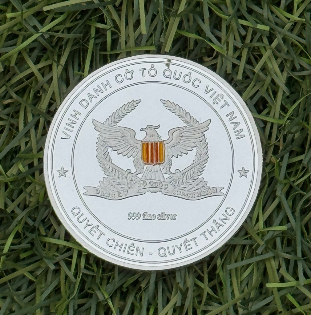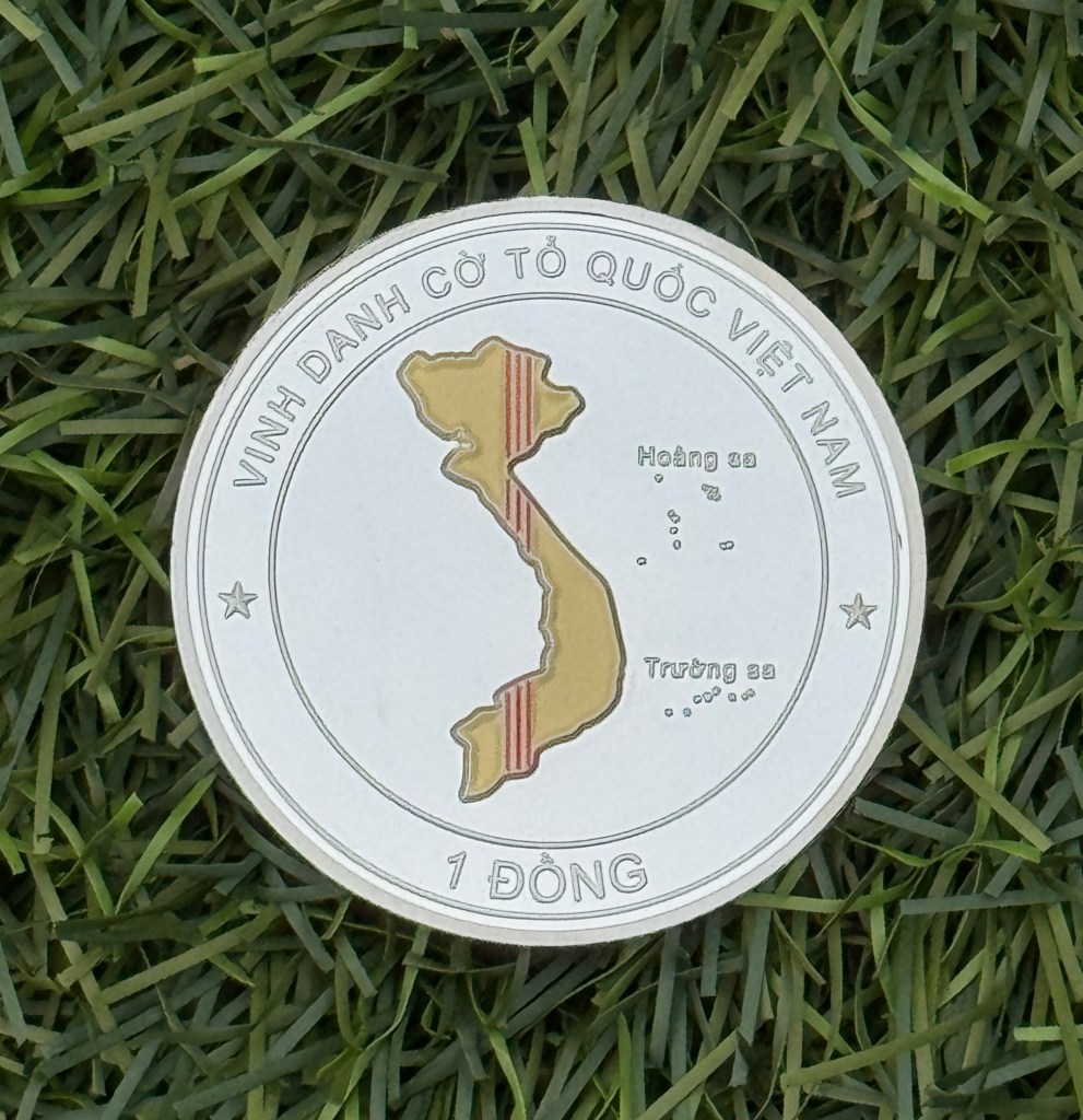 Tijdens de afterparty thuis bij de voorzitter van de NSVL – Ba Nguyen – ontving ik van mijn Vietnamese vrienden als herinnering een mooie zilveren munt van1 đồng en een gele vlag