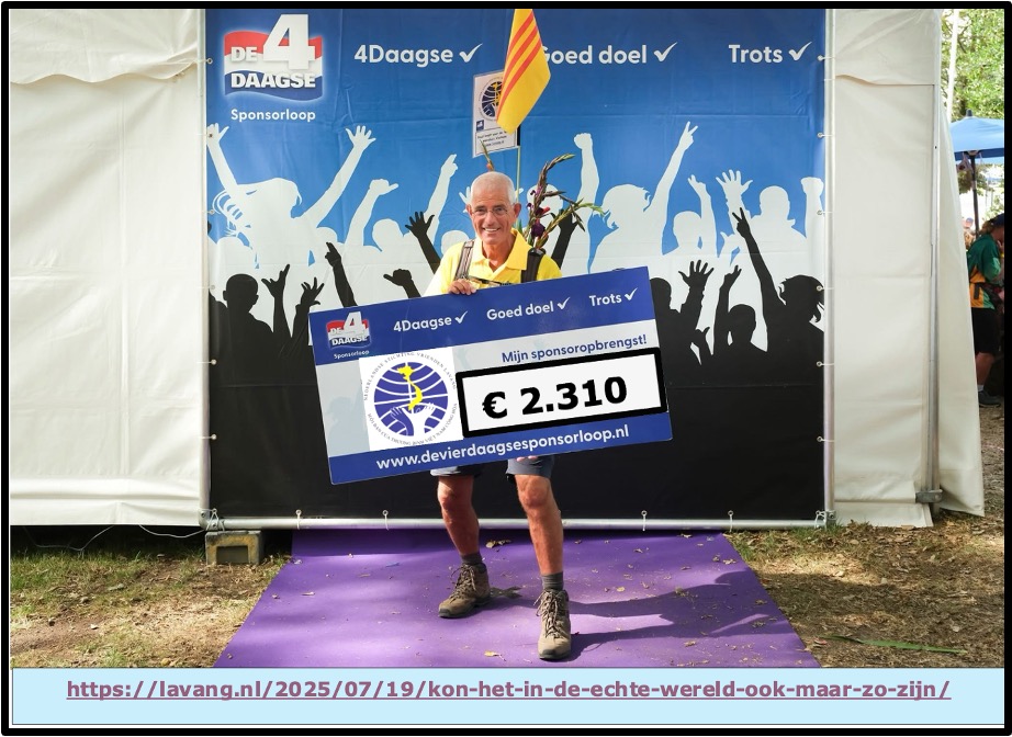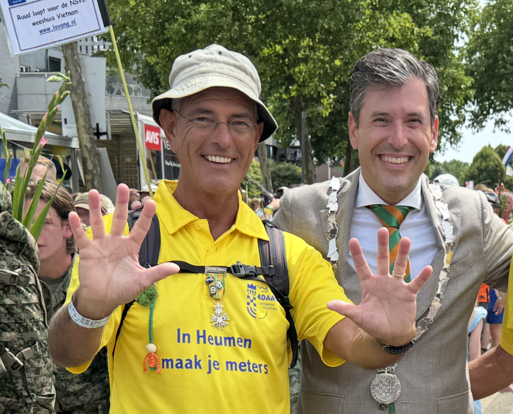 Tenslotte over de opbrengst van de VierdaagseSponsorloop voor de NSVL. Ons wandelteam bestaande uit Daniël, Long en Ruud, heeft via de speciale site van de Vierdaagse Sponsorloop en onze eigen bankrekening tot op dit moment maar liefst € 2.260 ingezameld voor de hulp aan Vietnamese oorlogsslachtoffers! Chapeau voor het wandelteam én voor alle sponsors en aanmoedigers lang de route. Vooral de laatste kilometers op de Via Gladiola waren een enorm feest voor ons. Iedereen heel erg bedankt voor alle aanmoedigingen! De voorbereidingen voor een nieuw wandelteam voor de komende jaren zijn al begonnen!